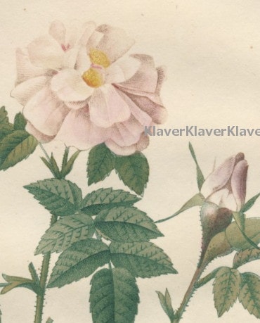 このふわふわな感じは、やはり初版ならでは、です。 こういう微妙な色合いこそ、初版だからこそ味わえるものなのですね。二版以降のものですと、確実に黒ずんできてしまうでしょう。 このバラは、「ワイルドローズとその派生種」に位置づけられながら、詳細は「不明」とされています。 バラの分類、ケンティフォリア系ですとかチャイナ系ですとか、そういった分類に当てはまらず、「不明」とのこと。それもまた、神秘的で魅力を感じます。 優しい気持ちになれるバラです。 額装は、A,B,Cどちらでも合うと思います。「A」のシンプルなものでも十分に映えますね。