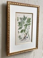 ハーブらしい葉と根、実が描かれていて、ボタニカルアートらしい一枚です。