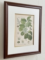 ウルシ科の樹木です。 いきいきとした葉と白い花が描かれていて、バランスの良い一枚です。 シンプルな木製の額でナチュラルにし、ゴールドのマット枠で華やかさをひとさじ加えました。 クラシックな部屋にも、ナチュラルな部屋にも合います。