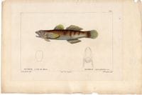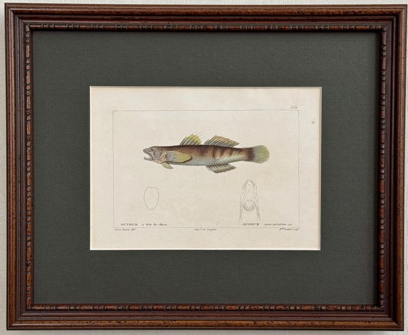 19世紀ヨーロッパの生物学の進化に大きな貢献をした、フランスを代表する生物学者のキュビエ。 その博物誌からの一葉です。 こちらは1828-50年に描かれた、ハゼの一種。 フランスのルドゥーテの系譜を継ぐ、息をのむほどの精巧な手彩色銅版画。 ウロコの一つ一つ、ヒレのヒダの一本一本、見事にていねいに描かれ、生き物への畏敬の念を感じる作品です。 かなり小さいサイズの作品です。 魚の体長は、11cm弱しかありません。額装しても、長辺33cm。ルドゥーテの小サイズの額縁と同じくらいです。 200年ほど前の当時のままの、本物の原本です。複製ではありません。