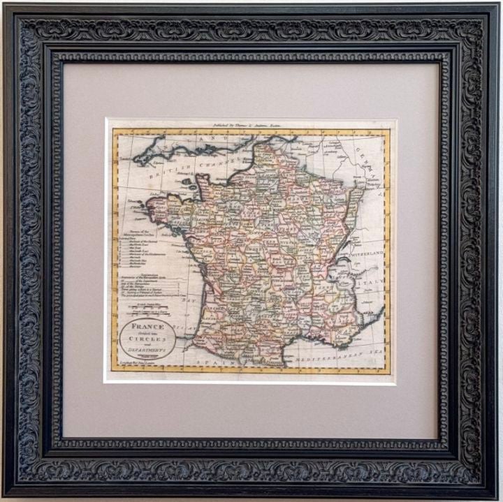 古地図 「フランス地図」原本 1796年〜革命後の近代フランス制度誕生を示す、趣深い地図〜 作: | 出版社:Thomas & Andrews(米国,ボストン) | 手法: | 銅版画、手彩色 | 額縁: | ブラック系 (額縁つきのお値段です)