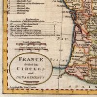 フランス革命直後に導入された「デパルトマン(県)」制度を反映した1790年代初頭の希少なものです。 左下に、"FRANCE divided into CIRCLES and DEPARTMENTS"と書いてありますね。 旧王政下の州区分ではなく、革命政府による新行政区分が色分けされています。 1789年にフランス革命、 1790年に行政区分改革で「デパルトマン(Departments)」制度導入、 つまり、Department制度が始まった直後の地図です。