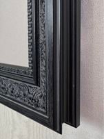 木製のどっしりとした額縁で、高級感あふれる仕様です。 ブラックですが、よく見ると墨色という感じで、重苦しくはありません。 知的なインテリアアイテムとしてぴったりです。